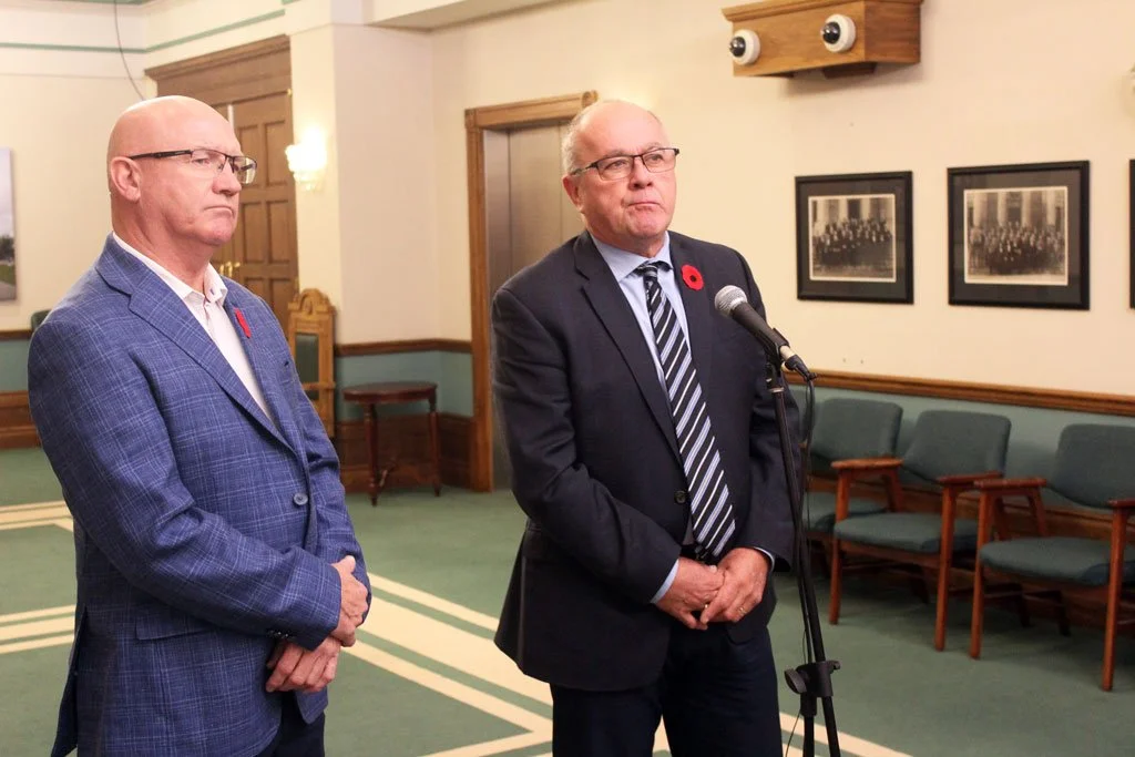 Minister of Fisheries and Aquaculture and Ferryland MHA Loyola O’Driscoll, left, and Minster of Transportation and Infrastructure Barry Petten speak to reporters on the heels of an announcement to construct a new breakwater in Trepassey following the havoc cause by Hurricane Melissa earlier this month. Mark Squibb photo