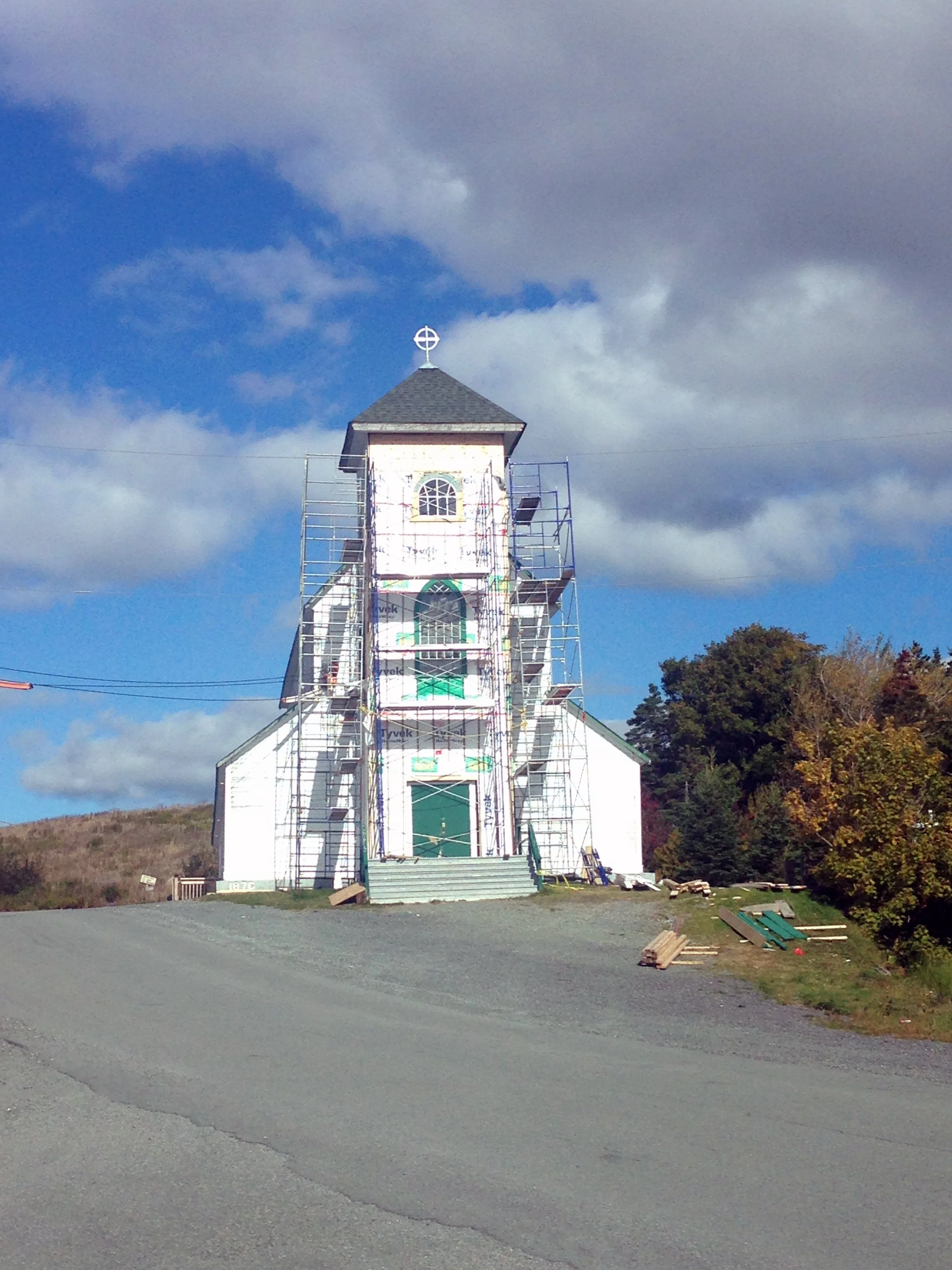 Holy Apostles Church in Renews as it looked in 2017 while it was undergoing renovations. Renews residents will be celebrating the 150th anniversary of the church's construction this summer. The church is next to the Mass rock where in the early 1700s Roman Catholics in the area gathered to hold mass in secret because it was illegal to do publicly. A grotto, built in the late 1920s, is also nearby.