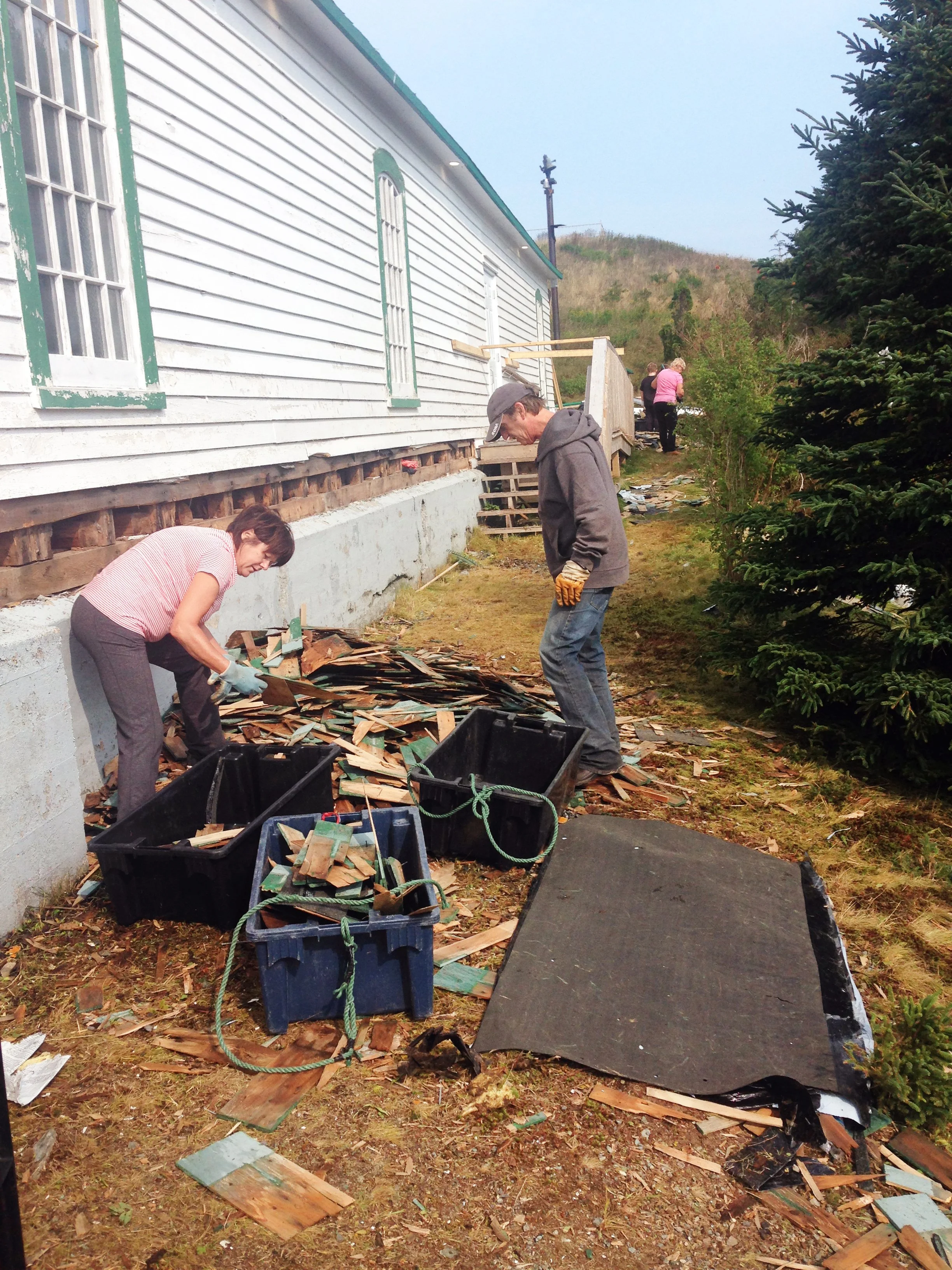 Jeanette Kenny, left, Gerard Hickey and Kathleen Fortin, in the background, were among the volunteers who helped clear away pieces of the old roof of Holy Apostles Church in Renews during a work bee in September 2017. Submitted photo